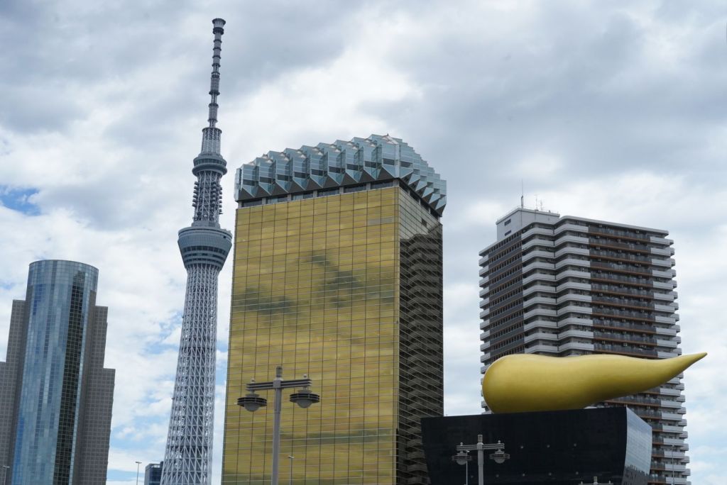 Autour de ce spot, la Tokyo skytree de plus de 630 mètres de haut et de 450 étages, elle-même très courrue, pour sa vue imprenable, le centre d’information pour le tourisme de Kengo Kuma et le Asahi Hall de Philippe Stark sans oublier le fleuve la Sumida.