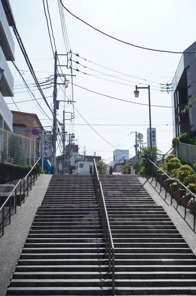 Enseignes de la rue commerçante principale à Yanaka et d’un de ses nombreux escaliers