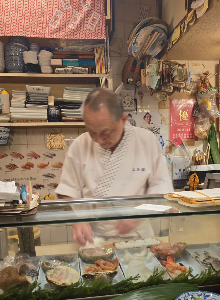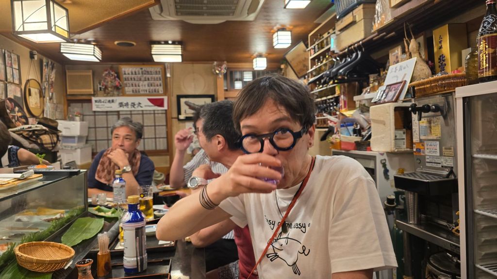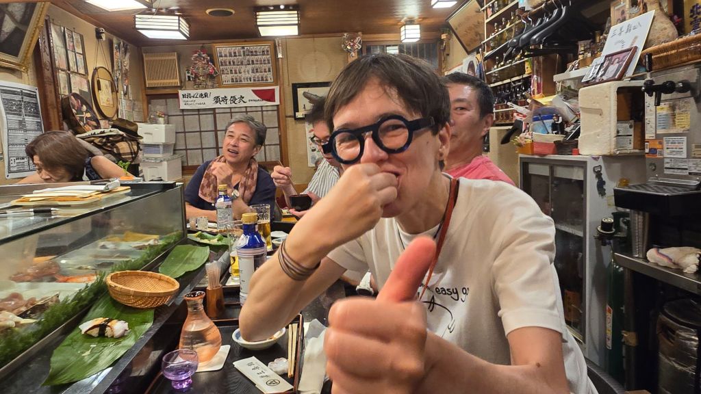 Un taisho, maître sushis, et différents personnages autour du bar, m’ont fait vivre une très belle soirée tout court. Avec mon voisin de droite, grâce à Google translate, nous avons beaucoup parlé, en particulier du surtourisme au Japon, à Kyoto et certains quartiers de Tokyo, comme le Senso-ji à Asakura. Il sort sans femme ni enfant, 1 fois par semaine, et était très intéressé par le pourquoi de ma venue au Japon..Au-delà de la culture, la cuisine et les alcools, lui ai-je dit. Cela lui a plu d’autant plus qu’il est chef lui-même et semble rencontrer des difficultés à vivre de sa passion.