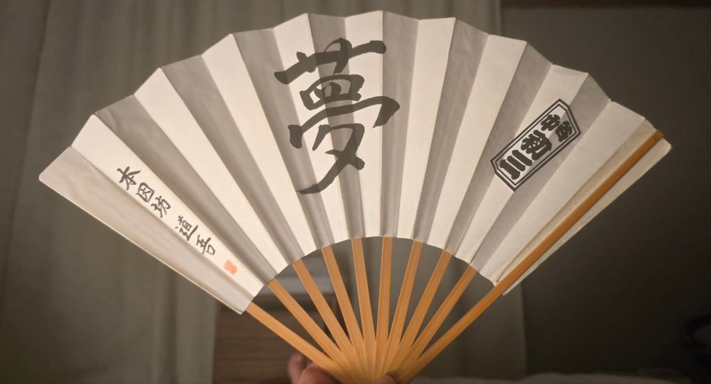 Mon voisin de droite m’a offert son éventail avant de partir, qui reprend une citation de l’époque d’Edo en substance « les personnages sont un rêve ».