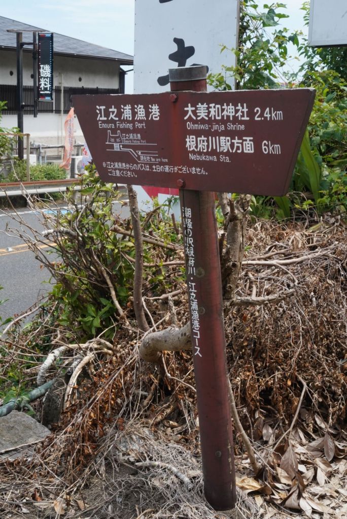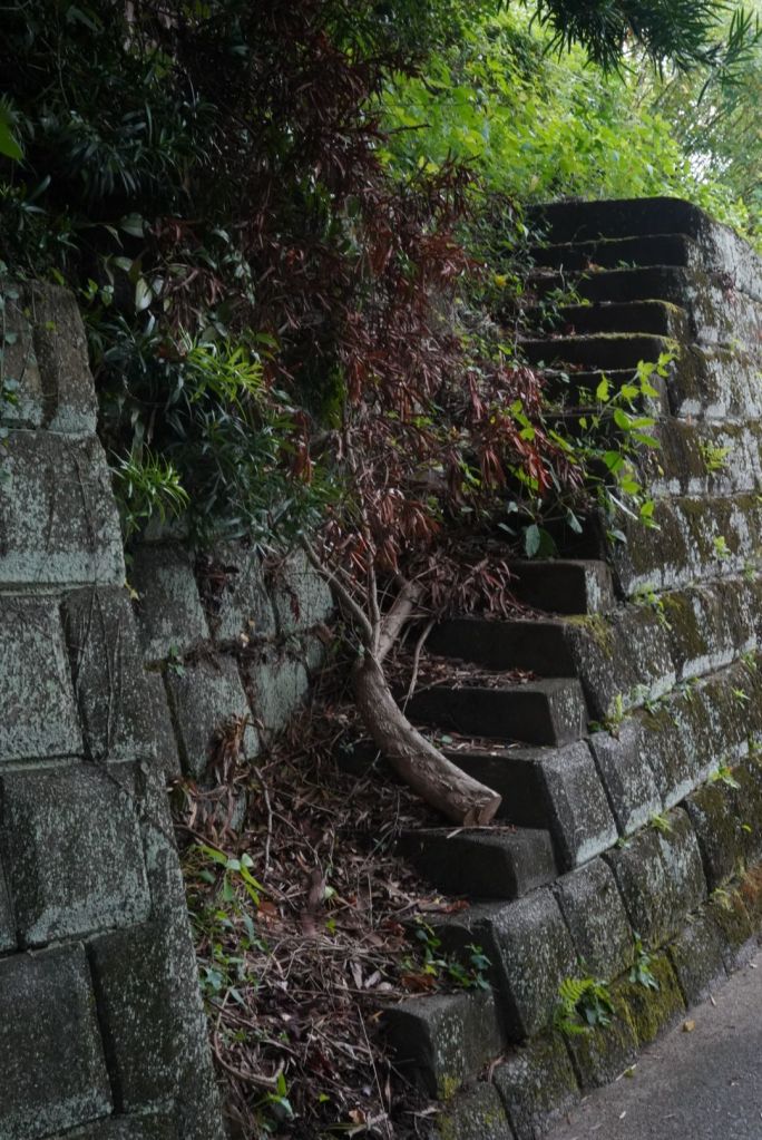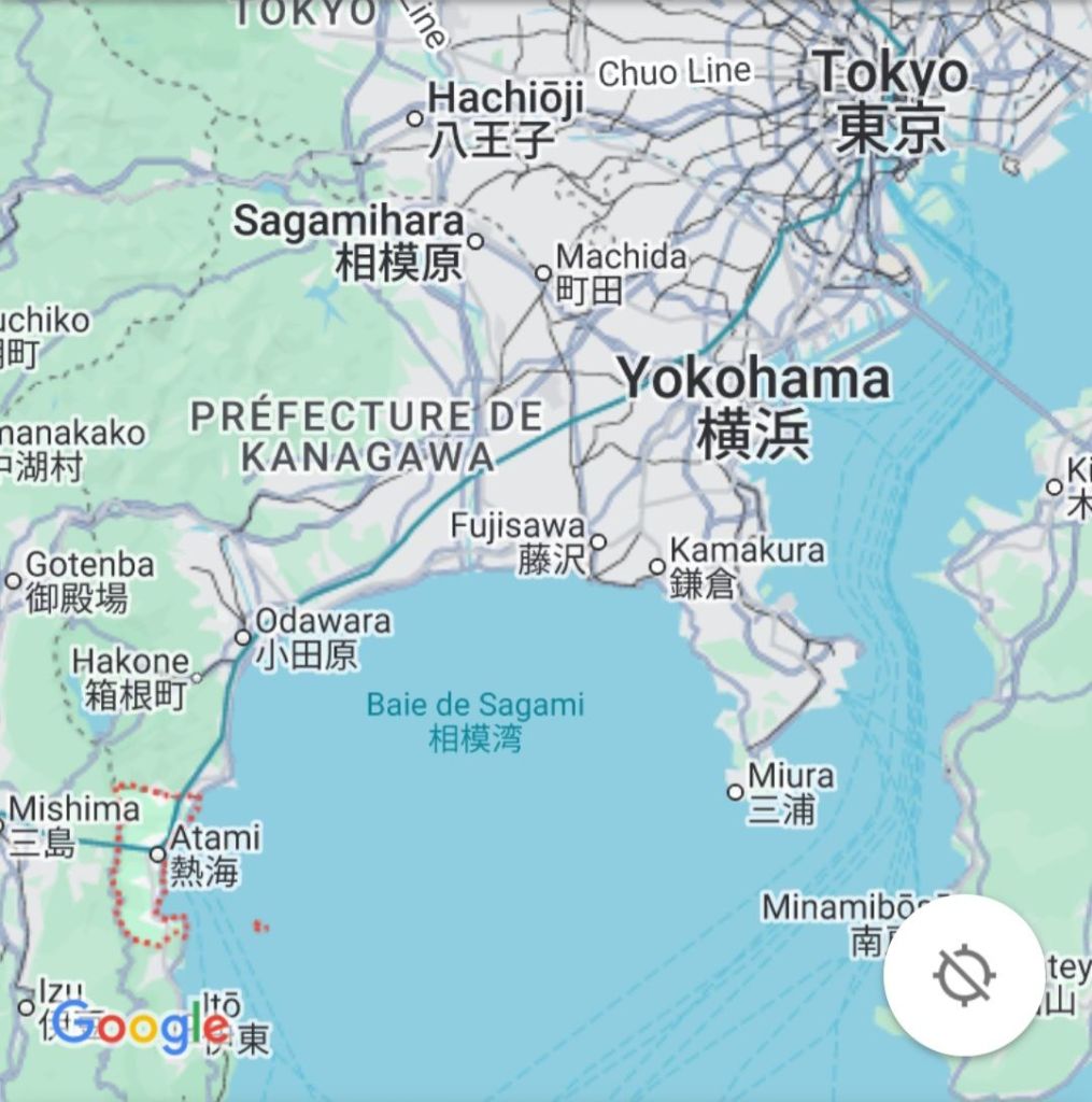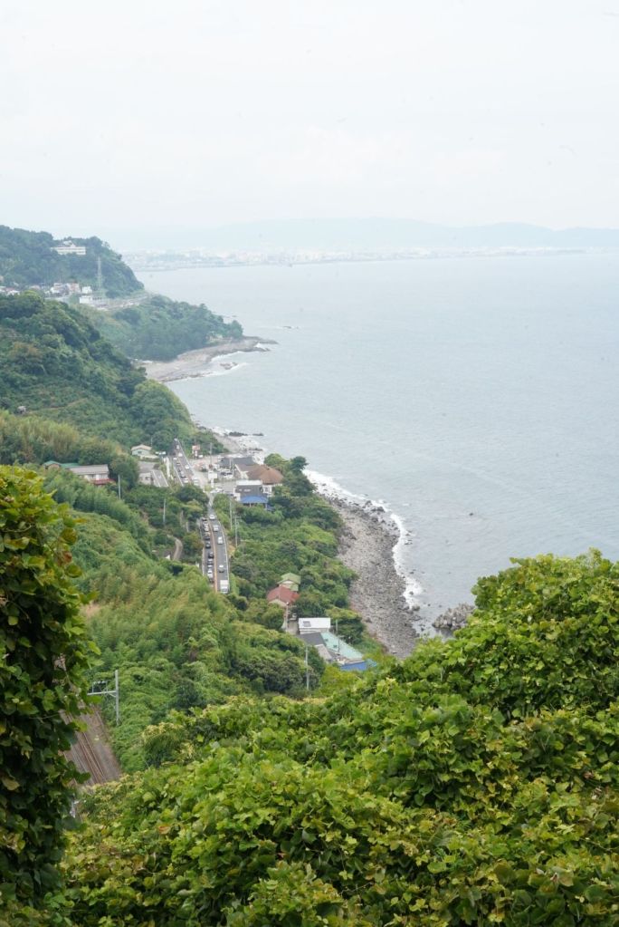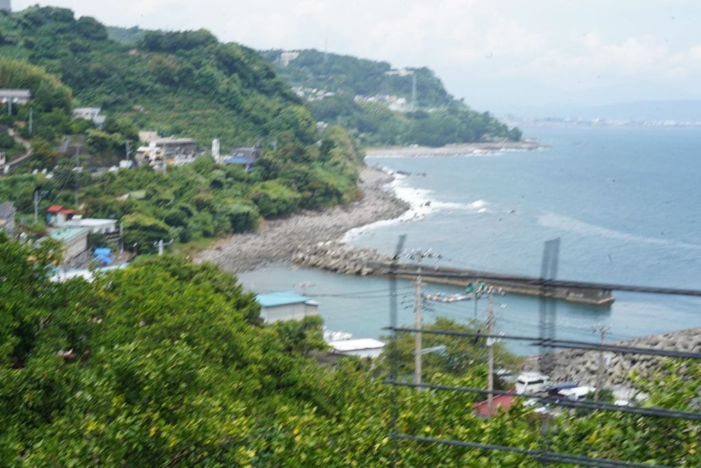 Journée de folie, j’ai crapahuté mais ça valait le coup, même si j’ai autant aimé, voire plus, le chemin, que le spot. Je suis allée à Atami par le train rapide à 35 min depuis la gare de Tokyo. Cette station balnéaire, qui joue un rôle clé dans Voyage à Tokyo, l’un des chefs d’oeuvre d’Ozu, se situe au sud de Tokyo, sur la baie de Sagami, à l’ouest de Kamakura. De là, je suis sautée dans un train régional, omnibus, qui a pris son temps, attente à quai et tortillard jusqu’à Nebukawa. Et, puis, j’ai marché, en prenant un GR parfois magnifique, sur certains tronçons pénibles car sur la route et croisant les voitures, heureusement au pas, sur peu d’espace pour les piétons, et d’autres encore au milieu de grandes herbes non fauchées…1h30, peut-être plus, sous le kokusho, ça casse et en même temps, ça m’a préparé, j’aime les chemins, la route, la marche, pour elle-même. Je regarde, je m’arrête, je bois, je respire, je pense, j’avance.