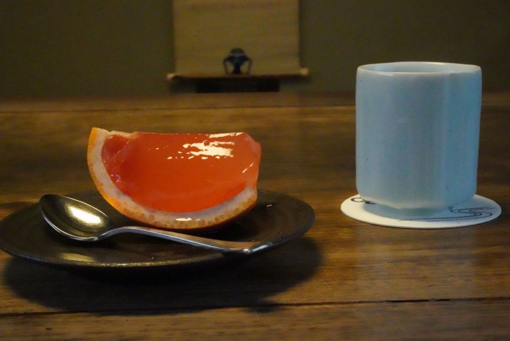 Et, puis, j’ai déjeuné, par hasard, dans un restaurant époustouflant, entre Akihabara et Ueno, dans une salle privative, digne d’un ryokan, de l’anguille séchée et en dessert du pamplemousse en gelée exceptionnel. J’étais en sueur, l’endroit était très classe, ils m’ont dit d’accord…