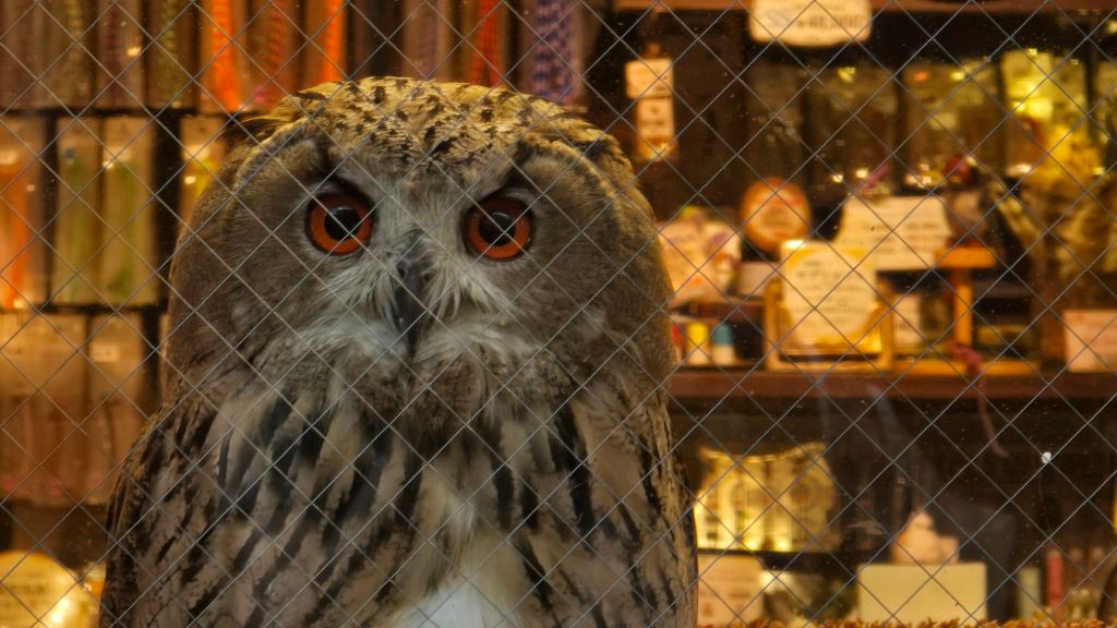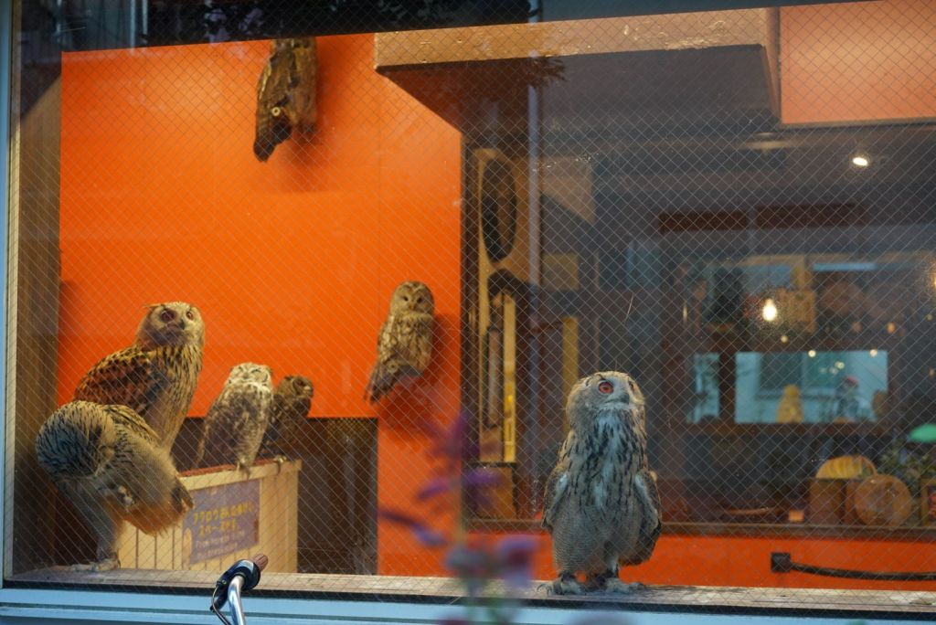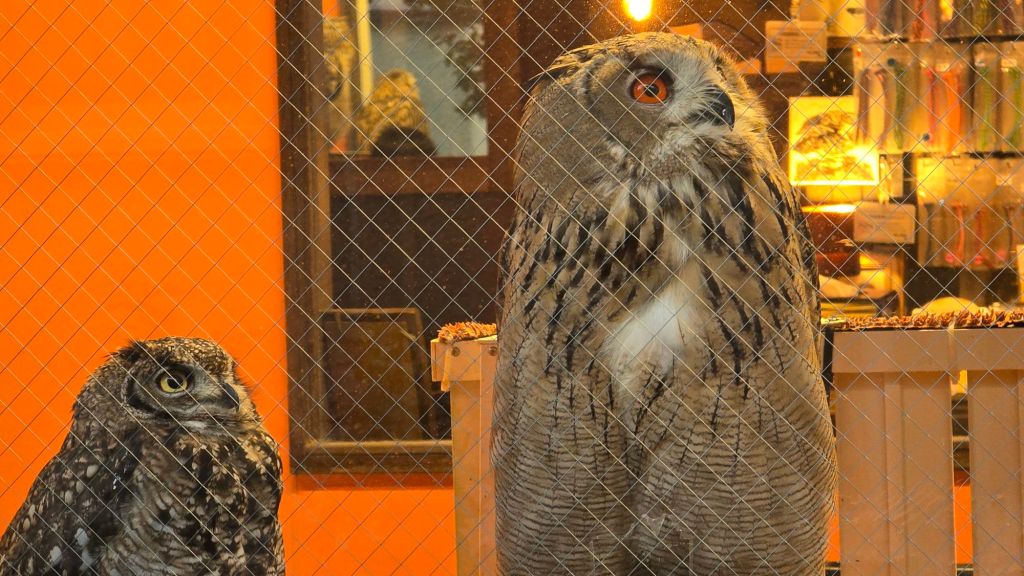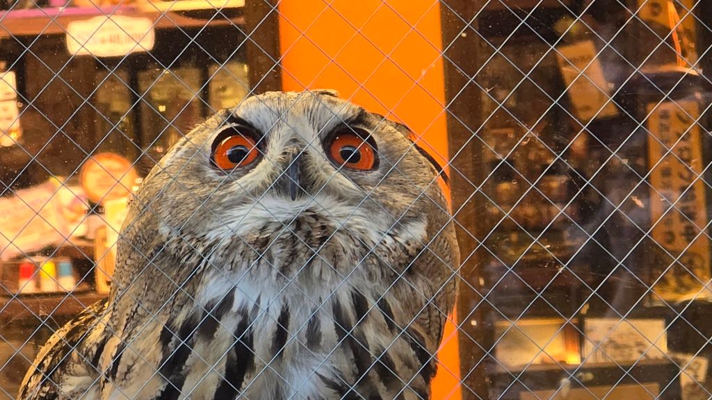 C’est chose faite, à Tokyo, j’ai vu des chouettes dans une volière, derrière des grandes baies vitrées, à l’intérieur d’un bar serti de murs orange, le délire nippon dans ses excès qui dépassent l’entendement. Je n’en pouvais plus, j’ai fait une petite vidéo, et vers la fin, j’ai eu l’impression que la chouette parlait.