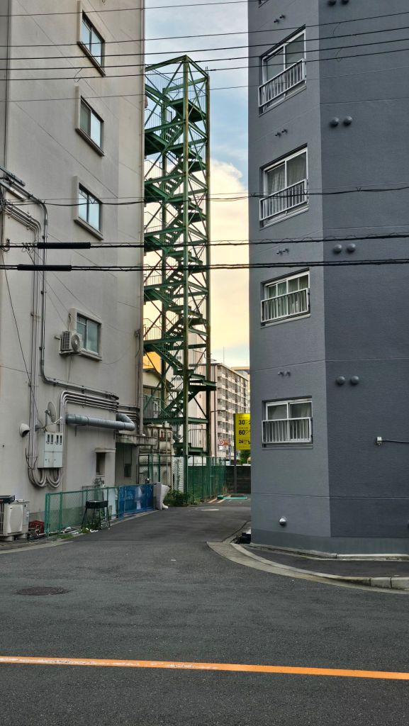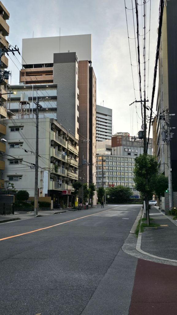 Après mon thé matcha au lait, je prends le chemin pour regagner mon hôtel, et mets mon nez dans les rues adjacentes, qui se croisent à l’Américaine, (quadrillage parfait, géographie verticale, vastes ensembles) plutôt calmes, voire désertes, à la différence de la gare et du centre commercial qui grouillent de monde. Comme souvent, autour des gares, ce n’est pas l’opulence ou la joie. Quoique la gare de Tokyo, sa façade regardant vers les jardins impériaux, contredit cette règle, tout en restant une exception.