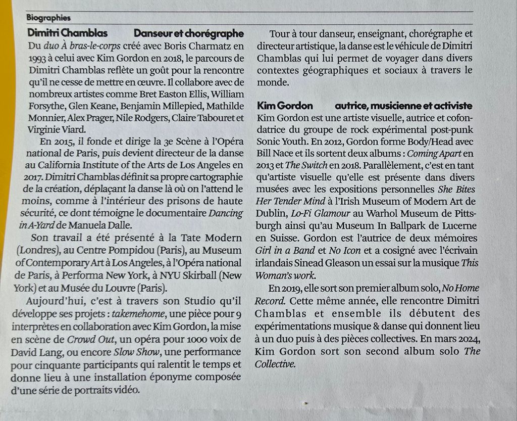 La musique de Kim Gordon accompagnait et jouait parfois le 1er rôle, 5 guitares sonnant ensemble, branchées sur des amplis, ça réveille, et puis, à la fin, le silence, le danseur chorégraphe du Burkina, seul sur scène, esquisse ses derniers pas avant de disparaître à son tour.