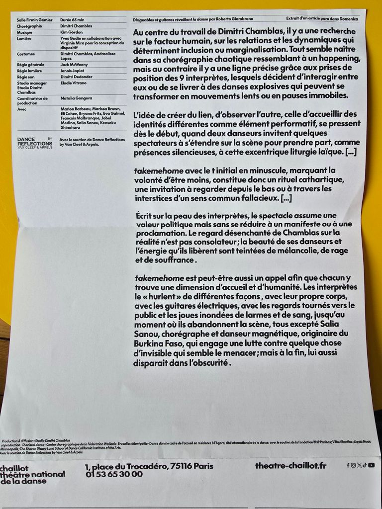 Le spectacle, Takemehome, à l’affiche du théâtre national de Chaillot, créé par le chorégraphe Dimitri Chamblas, sur une musique originale de Kim Gordon du groupe Sonic Youth, se jouait pour la dernière, à 15h. Ce fut, tour à tour, relaxant et électrisant puis relaxant. Marion Barbeau, 25 ans, première danseuse de l’Opéra de Paris était de la partie.