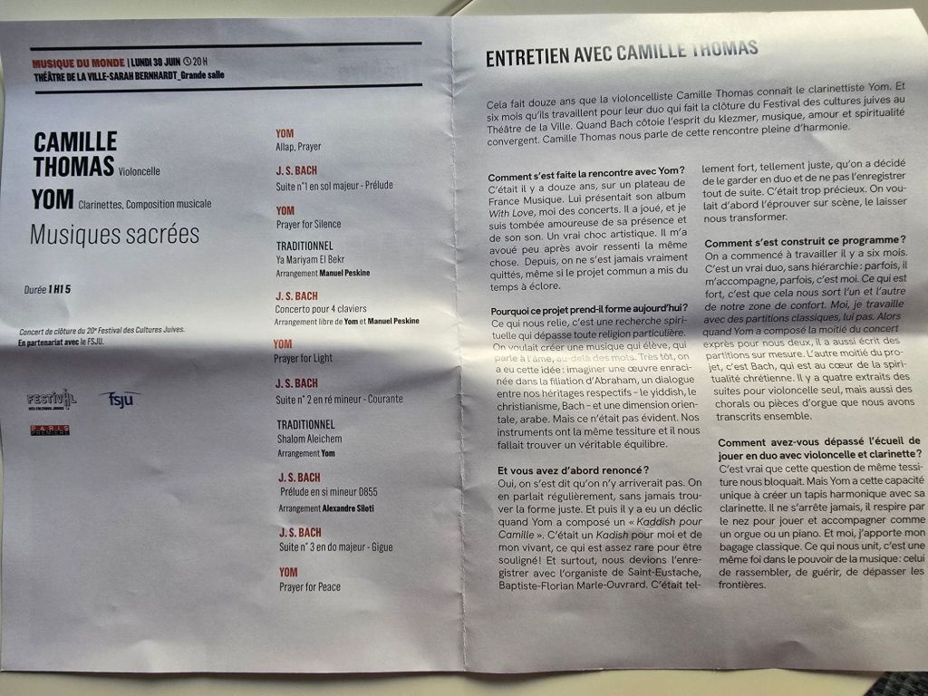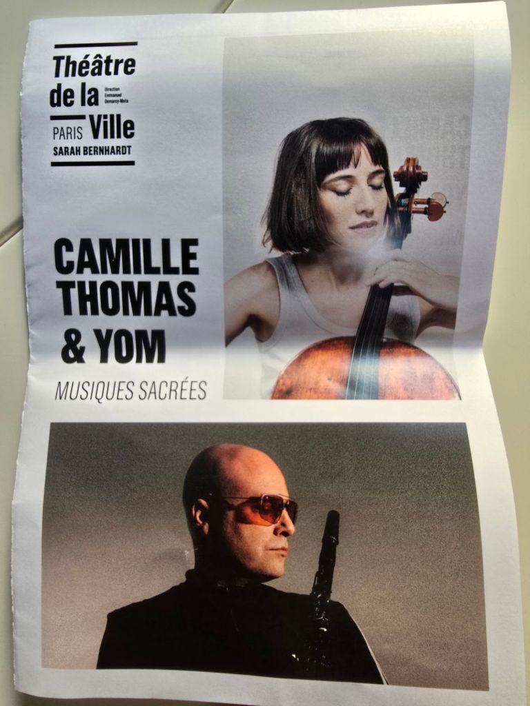 Hier soir, détour après le boulot par le théâtre de la ville avec un programme de musiques sacrées jouées au violoncelle, celui de Camille Thomas, immense concertiste, en duo avec une clarinette, celle de Yom un grand grand compositeur interprète klezmer. C’était superbe, final sur l’Ave Maria de Schubert.
