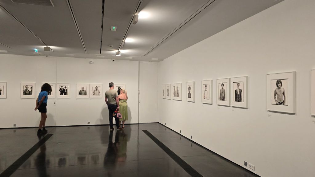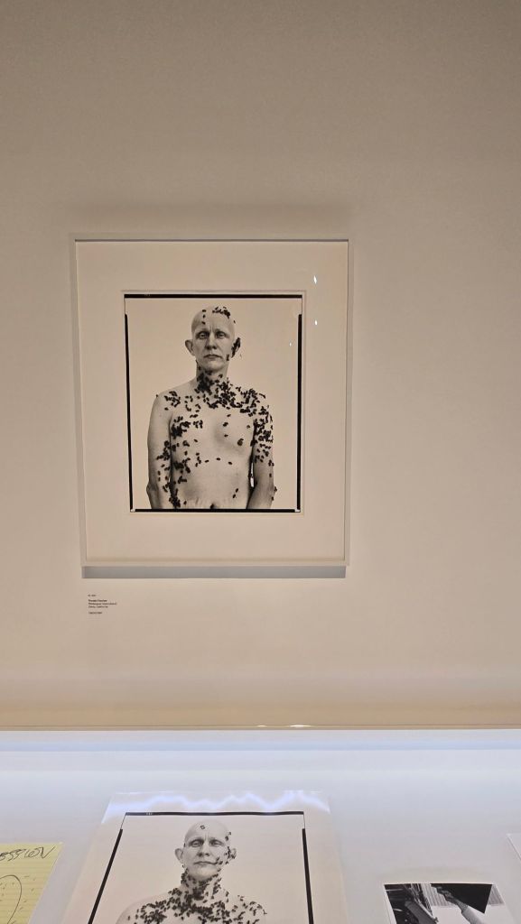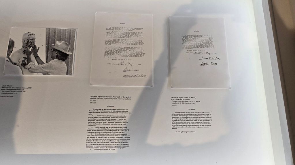 En point d’orgue, l’apiculteur, le seul qui a répondu à une annonce, et qui a signé une décharge, pour éviter toute plainte ou procès du fait qu’il allait poser torse nu couvert de phéromone de reine. Cette mise en scène a permis d’attirer une centaine d’abeilles sur son corps, il ne fut piqué « que deux fois » le temps de 121 photos sur deux jours. Le portrait retenu le montre relativement zen, l’autre avec lequel Avedon a hésité est exposé sous une vitrine, il y montre une bouche plus pincée, un regard plus craintif et ressemble davantage à un martyr chrétien qu’à un moine bouddhiste…
