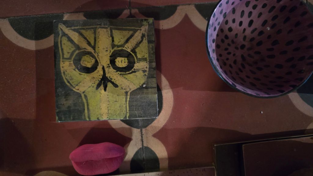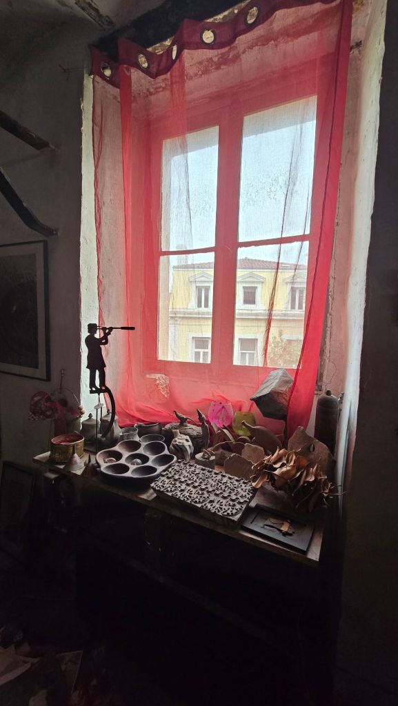 Difficile de décrire son lieu, sa maison, son antre sur 2 niveaux, l’atelier 100 m2 et son appartement 200 m2. Elle a fait le ménage pour moi, …et surtout elle m’a parlé et montré ce qu’elle a réalisé avec ses doigts dans chacun des recoins de son nid immense du sol au plafond en passant par l’électricité…