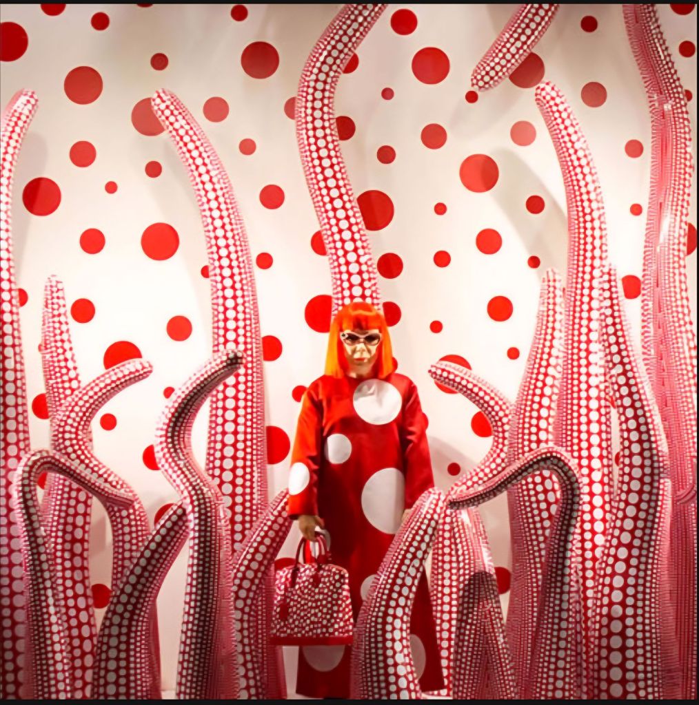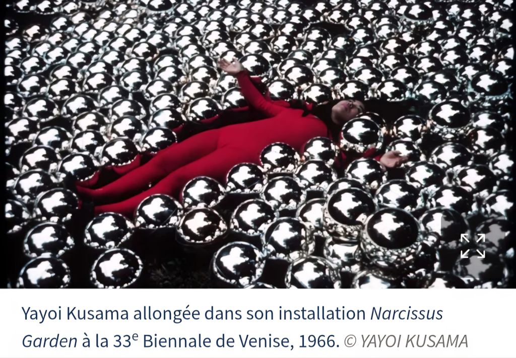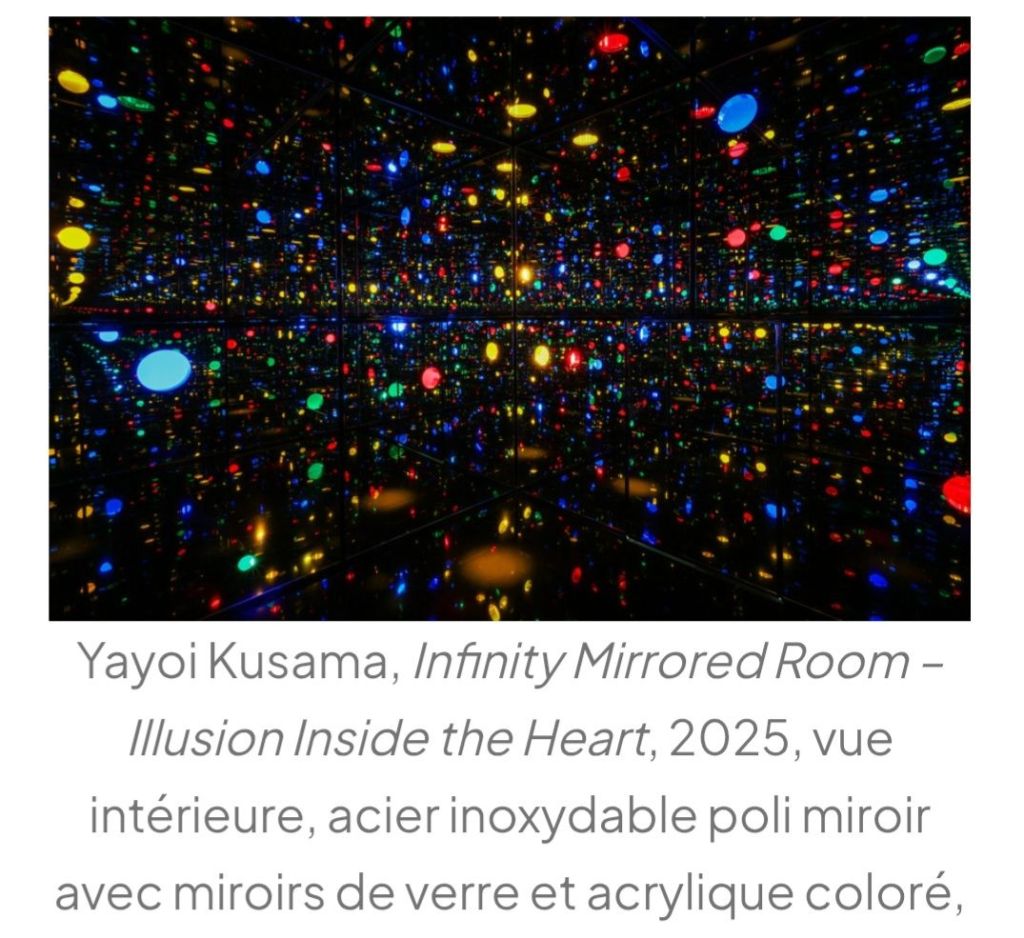 Yayoi Kusama est un poids lourd, sa vie est un pois parmi des millions de pois dit-elle. Elle est exposée actuellement à la Fondation Beyeler à Riehen près de Bâle. Elle peint, elle sculpte, elle réalise des structures dans lesquelles les lumières se réflechissent et le passant avec, elle créé dans sa maison de repos du cerveau au Japon, l’hôpital psychiatrique Seiwa à Tokyo. Elle a 96 ans.